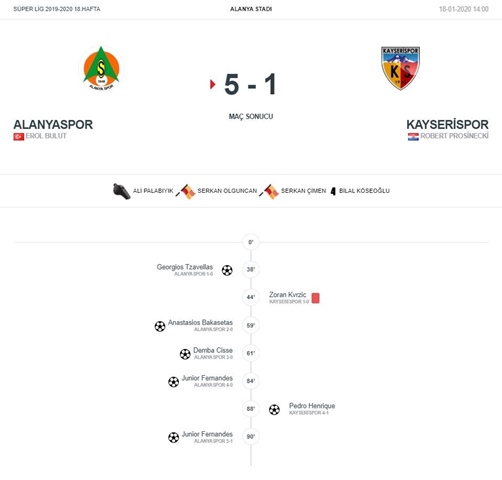 ⚽GOLLER ⚽ 38 Dk. Georgios Tzavellas (ALANYASPOR 1-0)’ ⚽ 59 Dk. Anastasios Bakasetas (ALANYASPOR 2-0)’ ⚽ 61 Dk. Demba Cisse (ALANYASPOR 3-0)’ ⚽ 84 Dk. Junior Fernandes (ALANYASPOR 4-0)’ ⚽ 88 Dk. Pedro Henrique (KAYSERİSPOR 4-1)’ ⚽ 90 Dk. Junior Fernandes (ALANYASPOR 5-1)’