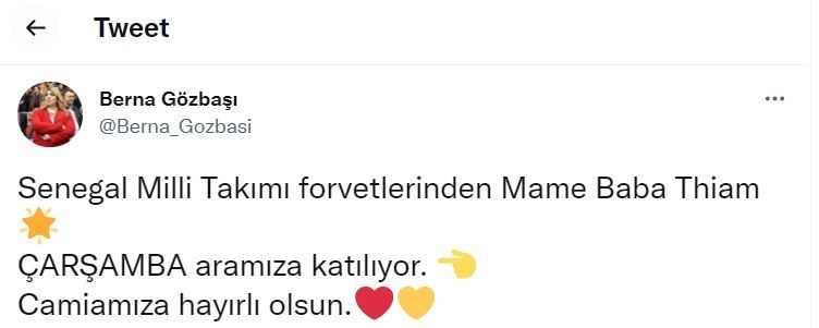 Kayserispor Başkanı Berna Gözbaşı sosyal medya hesabından yaptığı paylaşımda, Mame Thiam'ı transfer ettiklerini duyurdu.